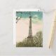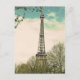 Hier ist eine Postkarte des berühmten Eiffelturms in einem Vintagen Look. Auf der Postkarte finden Sie den ikonischen Turm, die Bäume und den großen Himmel.