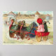 Vintages Erntedank-Bild mit zwei kleinen Kindern, die zwei Truthähne benutzen, um ihren Wagen in Richtung Erntedank Towne zu ziehen.