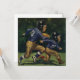 Vintages Bild für Kinder mit zwei Sportlern; die Kinder sind in Uniformen gekleidet, mit Stühlen und Helmen versehen und laufen mit dem Ball für einen Touchdown und Fußball.