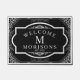 Elegante weiße, Vintage verzierte Wirbel bilden einen Rahmen für eine benutzerdefinierte schwarze Hintergrundfarbe. Individuell anpassbare Begrüßungstüren-Vorlage für Familienname und Monogramm. Wenn Sie eine andere Farbkombination mögen, schreiben Sie mir bitte Ihre Anfrage.