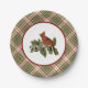 Papier Teller mit einer Vintagen Abbildung eines knallroten Kardinal Grosbeak, der auf einem Baum gekrönt ist. Gerahmt mit einem Plaidwerx Original Waldland Weihnachten karierte Muster in Moos grün, Cranberry rot, Creme und Gold. Wählen Sie aus zwei Größen. Passende Papierservietten sind erhältlich.