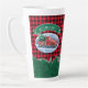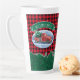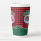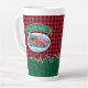 Trinken Sie Ihren Kaffee im Stil mit diesem Feiertag Thema Latte Tasse. In diesem Design befindet sich ein Vintager, roter Lieferwagen, der einen Weihnachtsbaum in einer Schneeszene trägt. Oben ist ein grünes Banner mit Ihrem Namen zu personalisieren. Der Hintergrund ist rot und schwarz Büffel kariert mit einer Reihe von Kiefern unten. Entworfen von weltberühmten Künstler ©Tim Coffey.