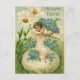 Auf dieser Postkarte befindet sich ein Vintager zeichn eines Kirschen, der auf einem Ei sitzt und blaue Blumen hält. Sie ist von weißen Gänseblümchen umgeben. Genießen Sie das Versenden dieses Vintagen Osterchorbs mit Blume Postkarte an Ihre Freunde und Familie in dieser Ostersaison.