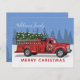 Diese Weihnachtskarte ist mit einem Vintagen Feuerwehrauto ausgestattet, der einen grünen schneebedeckten Kiefernbaum trägt und mit einem Kranz an der Tür verziert ist. Personalisieren Sie mit Ihrem Familiennamen und Feiertagsgruß, der lautet "Frohe Weihnachten". Entworfen von Susan Coffey.