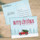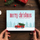 Eine Whimsical Vintage rote LKW Winterszene, die aus dem Wald oder dem Weihnachtsbaum zurückkehrt, mit dem Weihnachtsbaum in diesem Jahr im Schnee. Diese niedliche Weihnachtsfotokarte besaß einen rustikalen roten LKW und einen Vintagen Weihnachtsmann. Moderner, schlichter Weihnachtsweihnachtsbaum, klassischer Weihnachtsbaumkiefer, rustikaler, trendiger, klassischer Landhauswald, winziger fallender Schnee minimal, ein Vintager Aquareller, eine einfache Grafik-Cartoon-Illustration, Schneefall Winterszene, eine Feiertage, eine preisfreundliche Postkarte