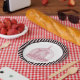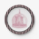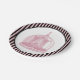 Diese Vintage Halloween-Tafel ist mit Rippen unter einer Glaskuchenkuppel in der Mitte mit schwarzen und rosa Streifen rund um den Rand ausgestattet.