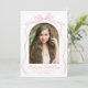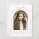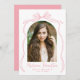 Mit dieser eleganten und zeitlosen Ankündigung des Abschlusses kündigen Sie den Erfolg Ihres Absolventen an. Das Foto wird in einem bogenförmigen Rahmen ausgestellt und mit einem handgezeichnet rosa Bogen und einem klassisch weißen Band auf einem klassischen Hintergrund schön hervorgehoben. Der Name des Absolventen wird in einem stilvollen, handgeschriebenen rosa Drehbuch gezeigt, das Schuljahr und Abschluss elegant unten dargestellt. Die Rückseite der Ankündigung beinhaltet ein horizontales Foto und Raum für eine benutzerdefinierte Nachricht, ideal für die Weitergabe von Dankbarkeit, Zukunftsplänen oder Party Details. Dieses ausgeklügelte und moderne Vintag-inspirierte Design ist ein herzliches Zeichen für den Erfolg Ihres Absolventen der Oberschule oder Uni!
