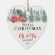 Rustikale Aquarelltöne, die ersten Weihnachtsbaumschmuck mit weißem Hintergrund, Aquarellbäumen, einem Vintagen roten LKW, einer mr und mrs Textvorlage für Sie, um sich anzupassen, und ein Foto der Neuvermählten auf der Rückseite.