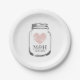 Vintager PapierParty-Teller mit Hochzeitsmonogramm plus Datum der Heirat. Kundengerechte Farbe und personifizieren Namensanfangsbuchstaben der Braut und des Bräutigams. Elegante Typografie im schicken Weckglasentwurf des rustikalen Landes. Niedlicher romantischer Entwurf mit Vintager Herzikone. Faded verwitterte Liebesymbol. WegwerfTeller für noble Hochzeit, Brautparty, Verlobung, tue ich Grillen, Jahrestag oder Junggeselinnen-Abschied. Kundengerechte Hintergrundfarbe. Vervollkommnen Sie für Scheunenhochzeit im Freienim Sommer gegen Juli, August, September.