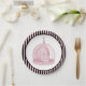 Diese Vintage Halloween-Platte ist mit einem Schädel unter einer Glaskuchenkuppel in der Mitte mit schwarzen und rosa Streifen am Rand ausgestattet.