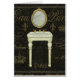 © Daphne Brissonnet/wildes Apple. Dieses Bild zeigt ein Vintages Spiegel- und Wannen-Set gegen einen schwarzen Hintergrund. Gold farbiger französischer Text kann auf dem Bild gesehen werden.