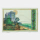 Vintage St. Patrick's Day-Karte mit freundlicher Genehmigung der New York Public Library. Es zeigt eine Burg in Irland gegen einen hellgrünen Himmel mit einer Kleeblatt-Grenze und Text, der St. Patrick's Day Gruß sagt.
