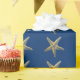 Navy blaues Geschenkpapier mit goldenem Seestern macht Weihnachten am Strand Spaß, Hanukkah Geschenke, und hübsch genug, um Strand Hochzeit Brautparty und Brautgeschenke zu verpacken. Die Hintergrundfarbe ist editierbar, damit Sie Ihre Wohngestaltung oder Hochzeitsmotiv am Strand an der Küste anpassen können.