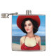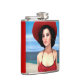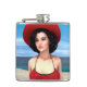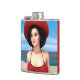 3D digitale Darstellung einer Vintagen jungen Frau mit einem roten Sommerkleid und einem Hut mit einem Gepäck auf blauem Himmel und Meereshintergrund