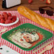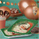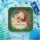 Papier Teller mit einem Retro-Bild mit einem lächelnden glücklichen Weihnachtsmann umgeben von einem Kiefernkranz mit einem Hauch von Heiligen in seiner Kappe.