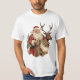 Weihnachts-T - Shirt mit einer lustigen Weihnachtsillustrierung. Der Weihnachtsmann in seinem traditionellen roten Anzug reitet auf einem großen, mit Heiligen dekorierten Rentier. Ein Weihnachtsbaum hinten.