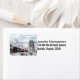 Rücksendeadressen-Aufkleber mit einem Foto einer eisigen Winterlandschaft mit schneebedeckten Kiefern. Ein roter, goldener und schwarzer altmodischer Zug, der durch die Wildnis fährt.