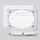 Diese elegante, blau-weiße Hochzeitskarte mit Vintager Luft hat einen Vintag staubblauen Rahmen mit barocken Dekorationen auf weißem Hintergrund. Der Text und die Zeilen sind auch staubblau. Der Titel UAWG wird in einem eleganten Kalligraphieskript geschrieben. Die Rückseite hat den gleichen antiken Rahmen, aber weiß auf staubblauem Hintergrund. Der Vintage, verzierte Rahmen basiert auf einer antiken französischen Buchbinderei von Georges Mercier (1885-1939) - Madame de Maupin von Theophile Gautier, Ausgabe 1911, jetzt öffentlich zugänglich.