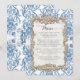 FÖRMLICHES ABENDESMENÜ FÜR DIE BREITE REZEPTION ODER DAS BRAUTPARTY. Klassisches und fabelhaft verziertes, goldfarbenes Aussehen, barocke Rokoko-Rahmen über einem eleganten, blau-weiß-französischen Vintagen Blumenmuster, das von dem international anerkannten Künstler Audrey Jeanne Roberts © restauriert und grafisch gestaltet wurde