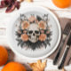 Ein auffallender, Vintager Schädel, umgeben von sanften pfirsichfarbenen Blumen, die ein klassisches Halloween-Ambiente haben. Ideal für leckere Ansammlungen der Saison, Party zum Abendessen mit Themen oder für einen kühnen Akzent an Ihrem Halloween-Tisch.