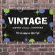 Vintages Banner für Vintages Business auf einer Messe, Kunsthandwerksstand, Flohmarkt-Stand. Das Wort Vintag ist in einem großen Retro-Schriftart des Mitteljahrhunderts. Alle Texte können bearbeitet werden. Ändern Sie den schwarzen Hintergrund in eine andere Farbe, wenn Sie möchten.