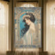 Inspiriert durch Alphonse Muchas Stil in den Farben aquamarines Blau, Pastellblau, gedämpfte Erdtönen, Beige und Gold. Die Handschrift ephemera des Skriptes wird sanft über das Crackle strukturierte Bild gelegt.