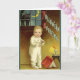 Vintage Illustration Halloween Urlaubsgestaltung mit einem kleinen Kind, das vor der dunklen Nacht Angst hat. Es ist eine klassische schwarze Katze und ein Halbmond im Fenster, und er ließ sein Buch mit beängstigenden Geschichten fallen. Eine Kerze sitzt auf dem kleinen Tisch. Halloween Gruß. Ellen Clapsaddle.