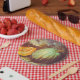 Ein schönes, farbenreiches, Vintages Bild eines blauen Kürbiskürbis-Set unter einem Baum. Ein Stück wurde aus ihm geschnitten, mit einem hellen orangefarbenen Fleisch. In den Farben Bernstein, Braun, Grau, Blau und Orange. Ein wunderbarer Gruß für jeden Herbstliebhaber.