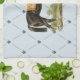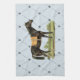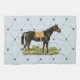 Ein schönes schwarzes Pferd mit Sattel in Vintager Farbdarstellung auf hellblauem gemustertem Hintergrund