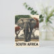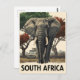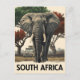 Dieses Vintage Reiseplakat vereint wunderbar die majestätische Safari in Südafrika. Im Vordergrund steht ein prächtiger afrikanischer Elefant, dessen starke Präsenz den Rahmen füllt. Im Hintergrund erinnern Safari-Jeep und klassische Akazienbäume an die idyllische Landschaft der afrikanischen Savanne. Der Kunststil mit seinen kühnen Linien und der erdigen Farbpalette erinnert an das nostalgische Gefühl der Reisewerbung Mitte des Jahrhunderts.