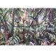 Dieser Vintage, nicht wiederholte tropische Stoff wurde mit einem Gemälde entworfen, das ein dichtes Gelände von Palmen und Weinreben in einem Dschungel mit einem staubigen rosa Himmel im Hintergrund zeigt.