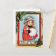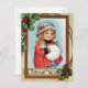 Vintage Weihnachtskarte, die ein kleines Mädchen eingewickelt herauf warm mit ihren Händen in einer weißen Pelzmuffe zeigt. Sie trägt eine Puppe und ein Buch und hat einen Sprig der Stechpalme in ihrem Hut.