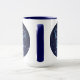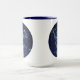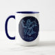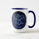 Tasse mit dem Zodiaksymbol für Virgo in sanft silberblau, als eine runde Medaille, überlagert mit den Sternen der Sterne, vor einem Sternenhimmel-Hintergrund, von tief Mitternachtsblau bis schwarz.