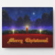 Scène de Noël en 3D créée en Vue, avec des bougies posées sur le rouge devant une guirlande de pins, rehaussées de rouge et d'or. Dans l'arrière - plan enneigé sont des sapins bleu-vert contre un ciel fractal tourbillonnant parsemé d'étoiles. Une étoile étincelante unique domine le ciel nocturne. Devant les décorations de vacances se trouve un salut Joyeux Noël doré.