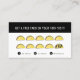 Cette carte de fidélité chic taco/mexicaine restaurant/food truck comporte un arrière - plan en damier noir avec un taco. Personnalisez-le selon vos besoins. Vous pouvez trouver des produits correspondants dans mon magasin.