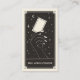 Ce carte de visite est décoré dans un style de carte tarot dans une palette de couleurs noir et crème. L'illustration montre une main tenant une carte avec des étoiles magiques dans l'arrière - plan. Cela serait parfait pour n'importe quel salon, coiffeur, professionnel de la beauté ou freelancer qui a besoin de cartes de rendez-vous pour leurs services et préfère un style alternatif. Ceci accompagnerait également les autres cartes de visite Tarot dans cette collection,