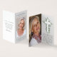 Nos petites cartes de prières commémoratives mesurent 2" x 3,5" lorsqu'elles sont pliées. Ce design a de l'espace pour une photo de votre bien-aimé sur le devant avec leur nom, dates et mots d'amour. A l'intérieur, vous pouvez ajouter une autre photo et un court verset ou une prière. Au fond, vous pouvez ajouter des mots de remerciement. Veuillez noter que cette carte ne peut pas être laminée. Nous avons une gamme de cartes de prières laminées à plat disponibles dans notre magasin.