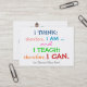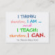 Je pense que le sentiment est clair, oui ... :) Ceux qui pensent autrement n'ont jamais enseigné. Ceci est également disponible avec de l'espace pour la personnalisation sur mes autres posters et produits d'enseignement. Citation originale sur les articles d'enseignants par Sharon Rhea Ford. Articles originaux des enseignants (avec copyright) par Sharon Rhea Ford ... Copyright : Tous droits réservés Enregistré : Sat Fév 07 14:31:50 UTC 2009 Empreinte digitale : Afficher l'empreinte digitale e3860c4f5cfa933c3ebf98f88c327b9377 00b9da37b2ee0a33851d36eddb Titre : Citation d'enseignement Description : Je pense; par conséquent, je suis, et j'enseigne; par conséquent, je peux. MCN : C9E78-CCFC0-4E856 En tant qu'enseignants, nous sommes des professionnels. Ayez un carte de visite prêt à distribuer aux parents. Donnez votre numéro de téléphone scolaire et votre adresse e-mail scolaire. Ajoutez des besoins ou des instructions de base si vous le souhaitez. Vous pouvez utiliser l'espace au dos en conséquence pour ajouter une note générique, supprimer une partie du texte, tout supprimer ... etc! Sur le mien, j'ai utilisé le stock papier le plus cher qui peut difficilement être détruit. Sur ce, j'ai utilisé Standard, donc jouer avec les stocks pour plaire à votre style! Merci et plaisir ! Meilleurs voeux pour l'année scolaire !