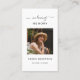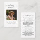Carte de prière commémorative de la Sympathie funéraire. Carte de prière avec une photo de la personne dont on se souvient, le titre sympathique "En mémoire d'amour", leur nom, et les dates de naissance/mort. Cette carte commémorative peut être remise à un ami ou à un membre de la famille en tant que gardien pour une célébration de la Fête de la Vie, la célébration de la Fête du Souvenir et le service funéraire, ou envoyée comme hommage spécial à ceux qui ne pouvaient pas y assister. Cette carte peut être personnalisée avec une photo préférée et votre choix de prière ou de poème. La photographie est à des fins d'illustration et peut être changée en une de vos propres. Vous pouvez le changer en un autre verset, poème ou prière si vous le souhaitez.