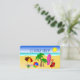 © Sunny Mars Designs. Diese vollständig anpassbare Visitenkarte bietet eine Beachszene mit Strandartikeln wie einem Sonnenschirm, einem Beachball, Flip Flops, einem Eimer und Pik, Palmen, einem Strandtuch und einem Surfbrett.
