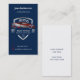 Vertikale Visitenkarte mit stilisiertem rot-silberfarbenem Sportwagenlogo für Kfz-Reparaturwerkzeuge oder Garagenfirmen. Sharp Look Design auf Marine mit vorformatiertem Text auf der Vorderseite und hinten ist für Sie bereit, mit eigenen Details zu bearbeiten.