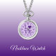 Collier Montre cadeau. Avec le mot "amour" et une forme de coeur remplaçant la lettre O. Foncé et violet clair.