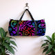 This image showcases a duffel bag with a highly textured and colorful leopard print. The individual spots are filled with a vibrant, almost pixelated or speckled gradient of colors, including various shades of blue, teal, green, yellow, orange, red, and purple. These bright, multi-hued spots stand out dramatically against the solid black background. The bag is equipped with dark, presumably black, carrying straps. This design gives the duffel bag a modern, energetic, and artistic appeal, perfect for making a statement while traveling or heading to the gym.