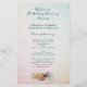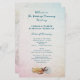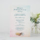 Programme de mariage pour les mers vivantes imprimé sur papier abordable. Customisez le texte des deux côtés sur un arrière - plan dégradé avec des coquillages à l'avant et plus de vie marine à l'arrière. Le texte est de couleur bleu marine et alterne entre le script et les polices imprimées. De l'espace est donné à l'arrière pour un court message du couple. Le papier a une taille de 5,5 x 8,5.