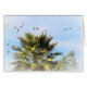 Vögel, die hoch über eine Palme fliegen. Blaue Himmel im Hintergrund.