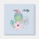 Bild eines Aquarellvogels, der auf einer Blume und Blätter in Aquarelltönen sitzt. Die Vogelfarbe ist rosa, blau und grün. Blätter sind in Blau, Grün und lila. Blume ist in Rosa gehalten. Die Hintergrundfarbe kann geändert werden.