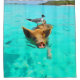 Pastellschweine mit einem Vogel, der im kristallklaren Wasser der Bahamas entlang reitet. Major Cay ist Teil der Exumas Cays in den Bahamas, wo die Schweine ursprünglich schwimmen und im Hintergrund gesehen wird. Die Schweine kommen jeden Tag zum Schwimmen heraus.
