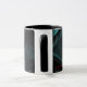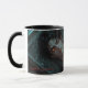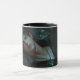 A black ceramic mug, smooth and cold to the touch, adorned with an eerie design. Against the dark surface, Floats in an endless abyss, his body suspended in emptiness. His black, tousled hair frames sharp feature, and his mismatched eyes—one orange, the other a mesmerizing blend of blue and green—seem to glow faintly in the void. Crimson trickle runs from his closed eyes and nose, adding an unsettling yet captivating touch to the artwork. He wears a fitted black shirt, mystical necklace resting against his chest, and a vivid green wedding ring on his finger. Chains dangle from his jeans, swaying in the weightless void. The surrounding darkness is vast, silent, and consuming, broken only by the quiet intensity of his presence. As steam rises from the mug, it almost seems as if the abyss breathes—shifting, whispering, waiting. A drink from this cup feels like sipping from the unknown, a momentary escape into the depths of something both haunting and beautiful.