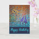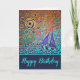 Un voilier survolant les vagues sous un ciel ensoleillé. L'eau et les vagues sont claires et bleues foncées avec des reflets du ciel coloré. Le ciel est rempli de bleus, jaunes, oranges et rouges. Le graphique a été donné une apparence métallique brillante. Joyeux anniversaire est sous le graphique en bleu clair contre un arrière - plan bleu foncé. L'intérieur de la carte dit : "Que vos années soient remplies de jours heureux. Joyeux anniversaire !"