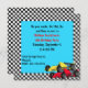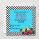 Invitation de fête d'anniversaire de garçon colorée, faite dans un motif en damier noir et blanc, avec une zone de texte carré turquoise. Les graphiques d'une voiture de course à formule jaune et rouge décorent le coin inférieur droit. Le texte en rouge et noir est entièrement personnalisable et prêt à être personnalisé pour le grand jour de votre fils.